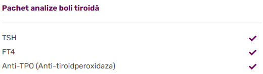 Protejează-ți sănătatea tiroidiană și gestionează afecțiunile tiroidiene cu ajutorul acestui pachet de analize specializate. Analizele incluse îți oferă informații despre funcția tiroidiană și te ajută să depistezi și să gestionezi afecțiuni specifice.